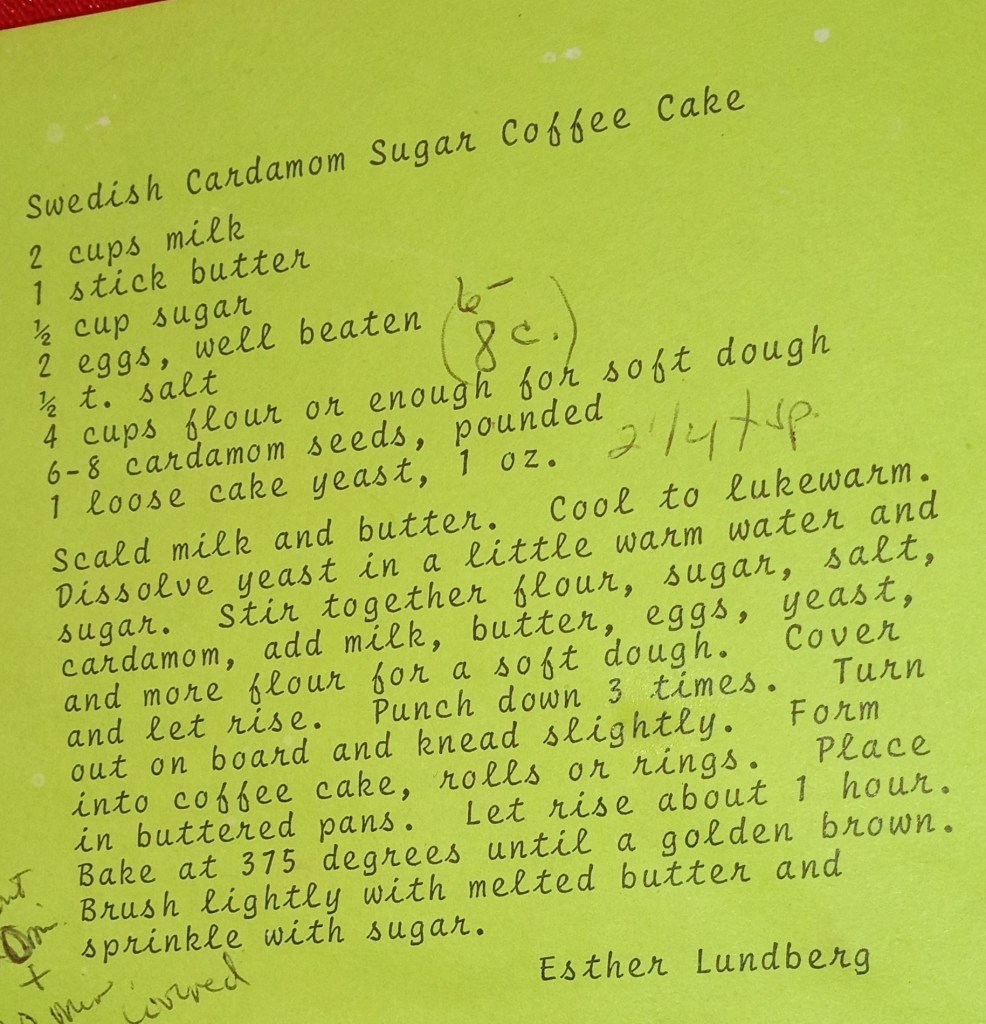 Mrs. Esther Lundberg was famous in my home church of Hinsdale Covenant (Illinois) for her baking, most especially her cardamom rolls. My mother said every new bride in the church would receive a visit from her with a basket full of her fresh rolls, but they were also afraid of her because she kept a close watch on their housekeeping skills. She probably didn’t really wear white gloves, but Mother hinted she believed they might be in her Mrs. L’s pocket when she came to call.